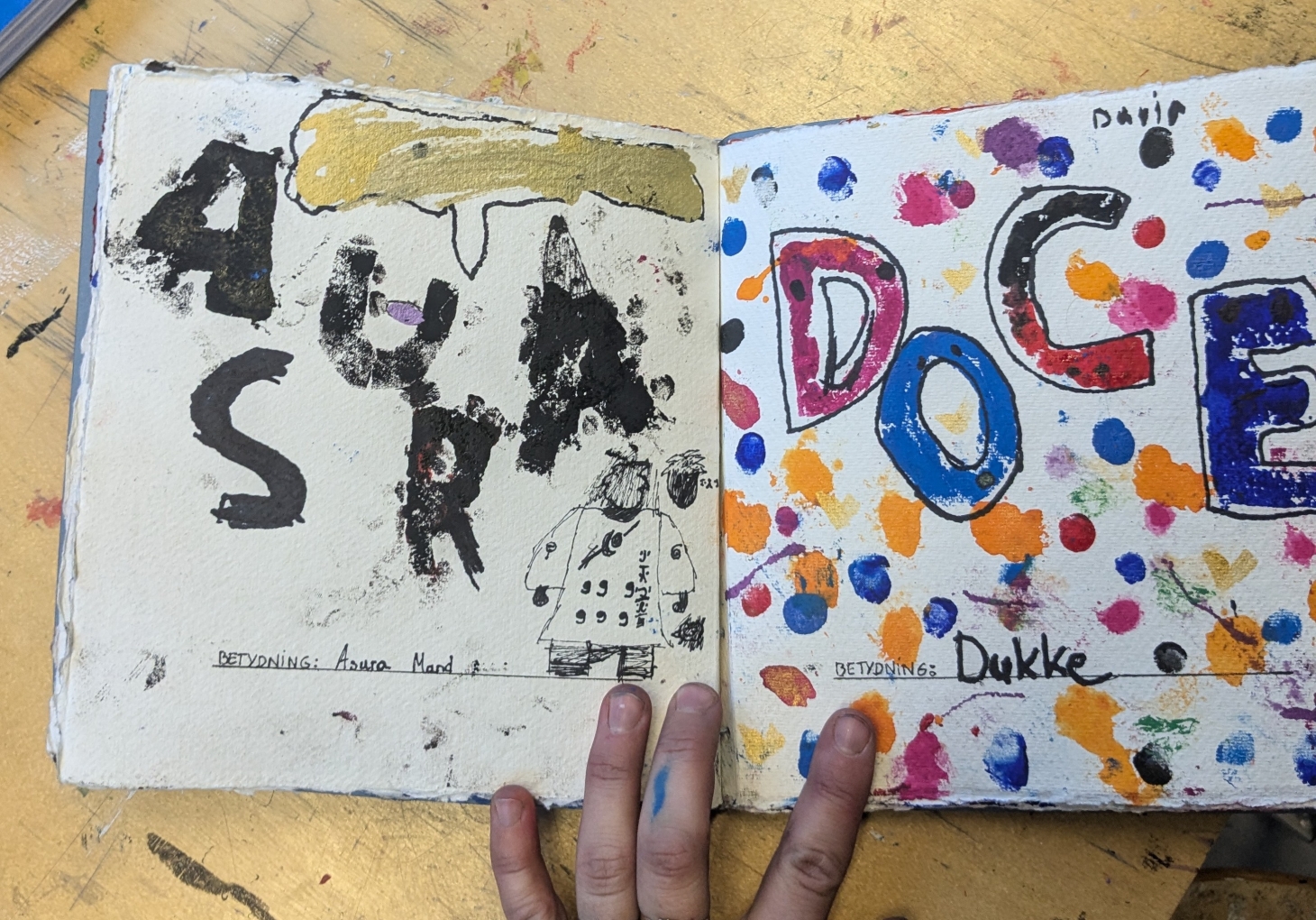 På workshoppen 'Bogstaveligt talt - Fantasiordbogen' laver vi grafiske tryk med bogstaver, som dekoreres med farver og mønstre. Vi bruger bogstaverne, og ikke mindst vores fantasi, til at finde på skøre ord og deres betydning. Afslutningsvis samles alle ordene i en hjemmesyet fantasiordbog, som klassen får med hjem.